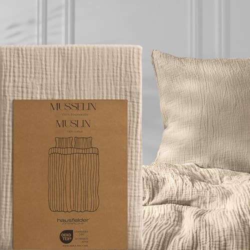 Pure Label Musselin Bettwäsche 135x200 cm mit einem Kissenbezug 80x80 cm aus 100% Baumwolle - Traumhaft weiche, kuschelige Bettwäsche-Sets in beige aus Musselin