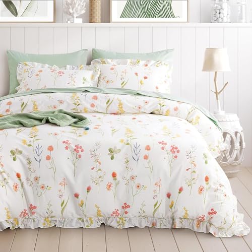Freyamy Blumen Bettwäsche 135x200cm 2teilig Weiß Grün Bunt Floral Blätter Pflanzen Mädchen Bettwaren-Sets Microfaser Deckenbezug Bettbezug mit Reißverschluss und Kissenbezug 80x80cm